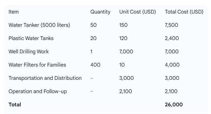 Estimate the total cost for the most suitable solutions (purchasing water – tankers – tanks – wells).